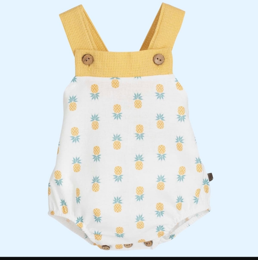 ORIGINAL PETO DE TIRANTES DE BEBE NIÑO DE LA NUEVA COLECCION DE CALAMARO PARA PRIMAVERA VERANO 2026 DE LA FAMILIA GAYA CONFECIONADO EN ALGODON ESTAMPADO CON PIÑAS  VIENE PRESENTADO EN CAJA PARA REGALO FABRICADO EN ESPAÑA .