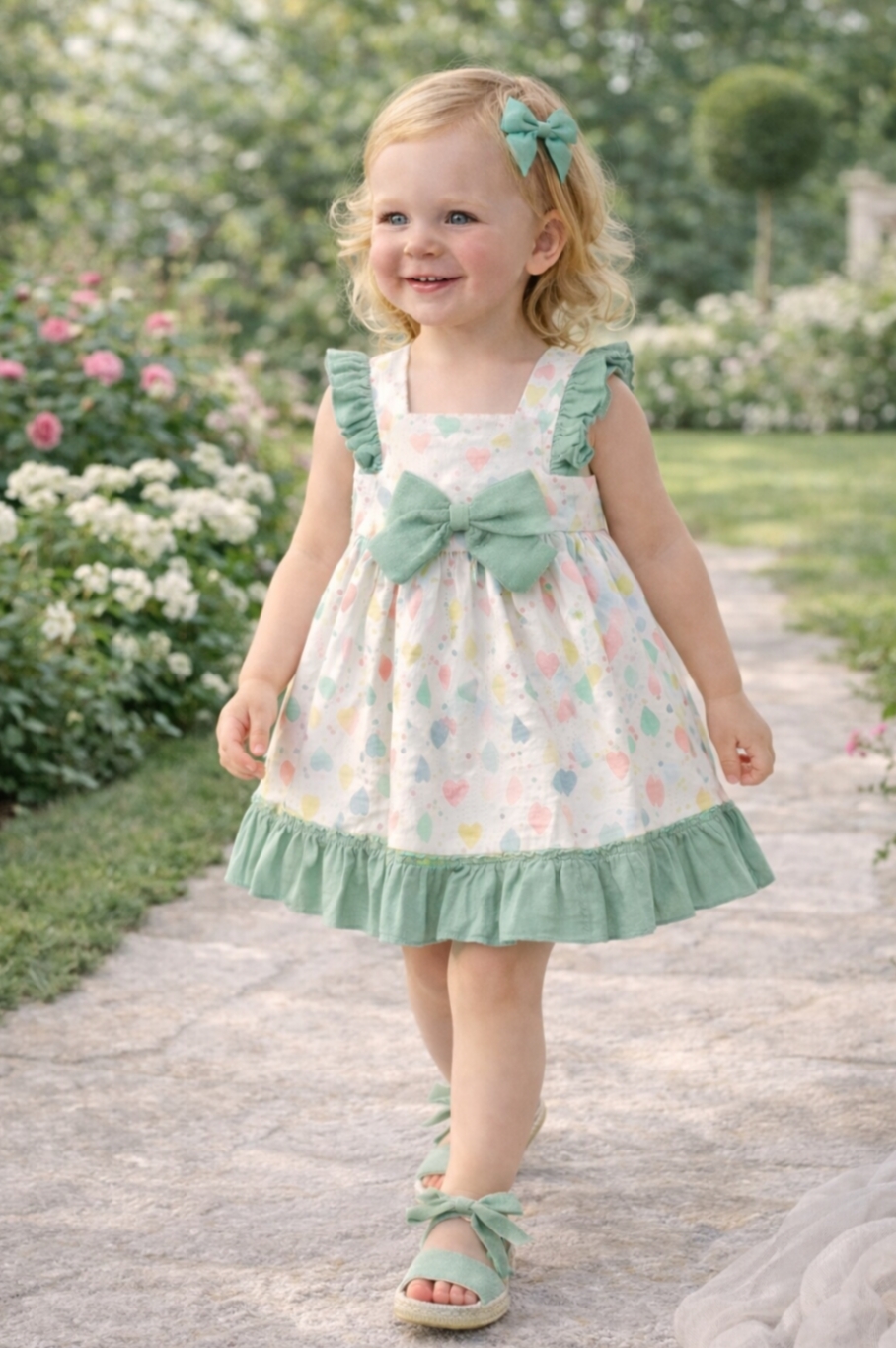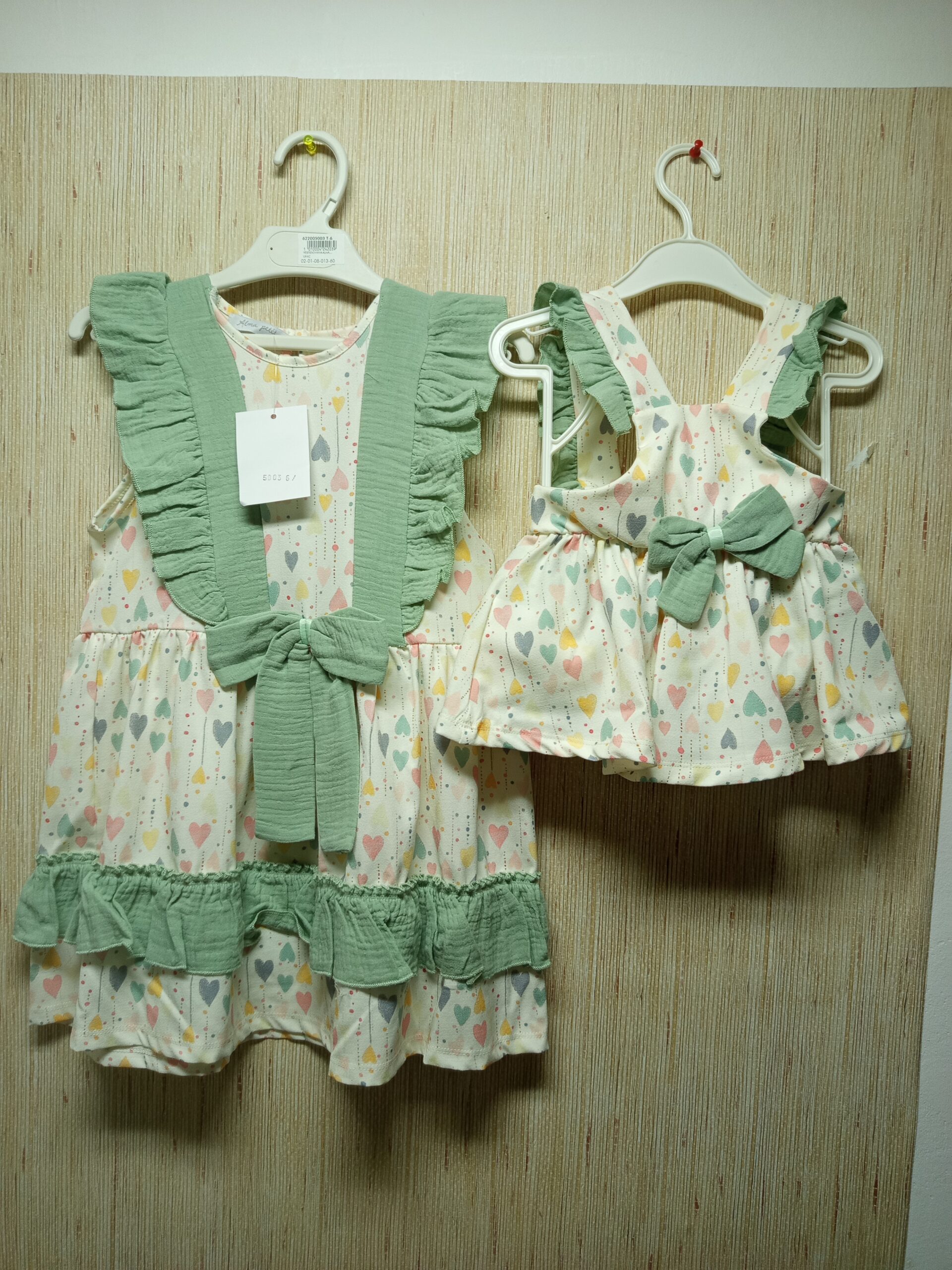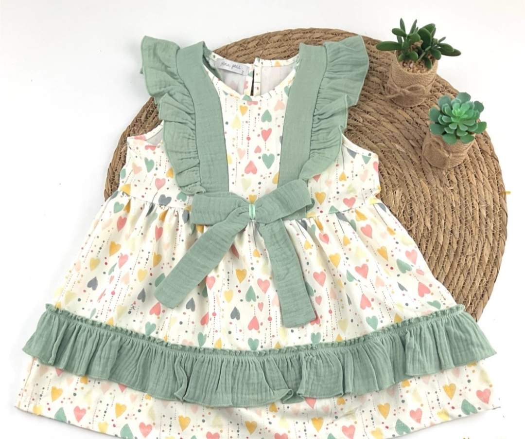 PRECIOSO VESTIDO ESTAMPADO DE CORAZONES CON VOLANTES Y LAZADA DE BAMBULA DISPONIBLE DE 3 A 8 AÑOS DISPONIBLE PARA HERMANAS