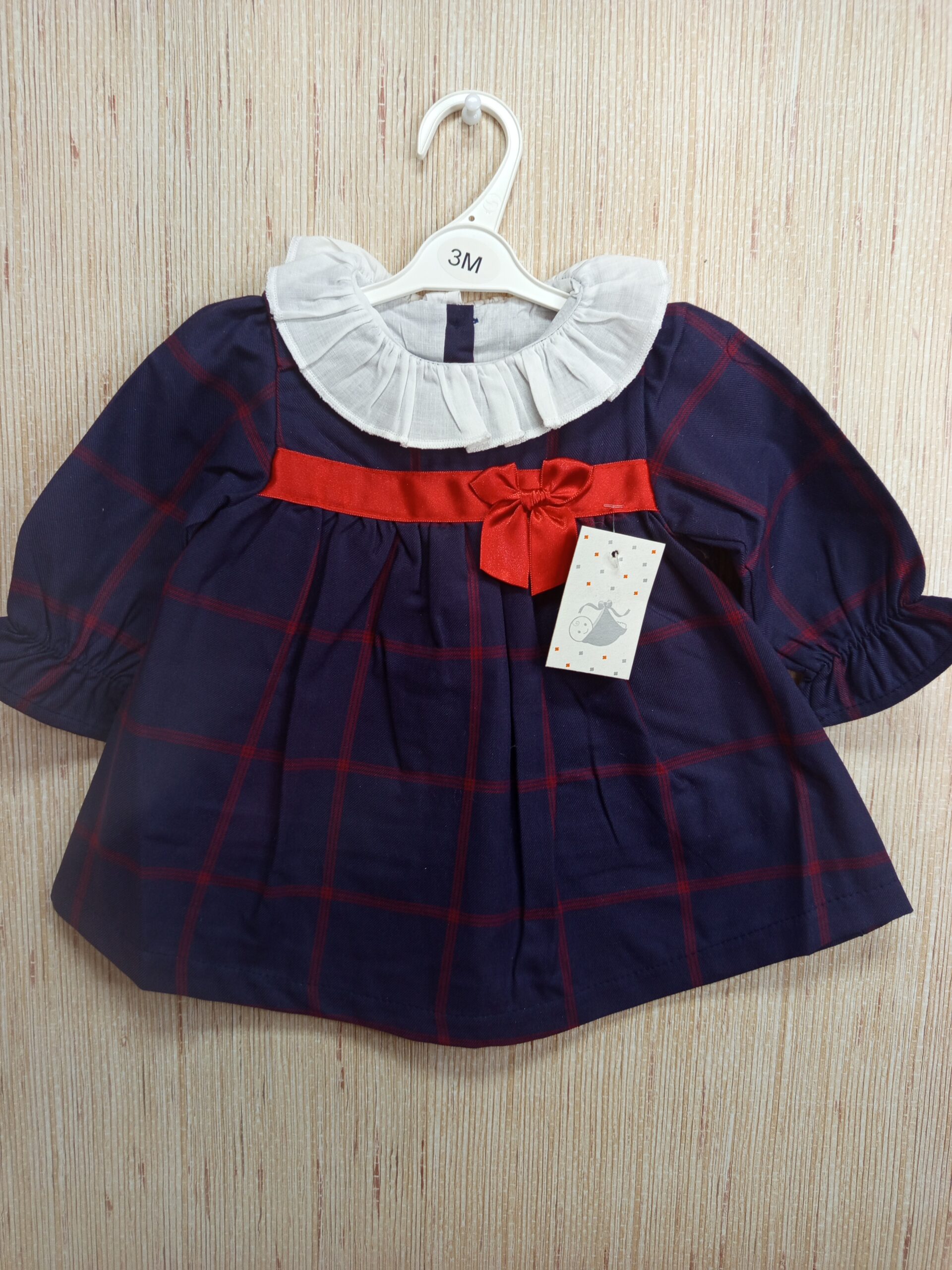 VESTIDO AZUL MARINO BEBE CON MANGA LARGA Y FORRO , CUELLO VOLANTE EN BLANCO Y LAZO ROJO DISPONIBLE DESDE 3 MESES HASTA 24 MESES